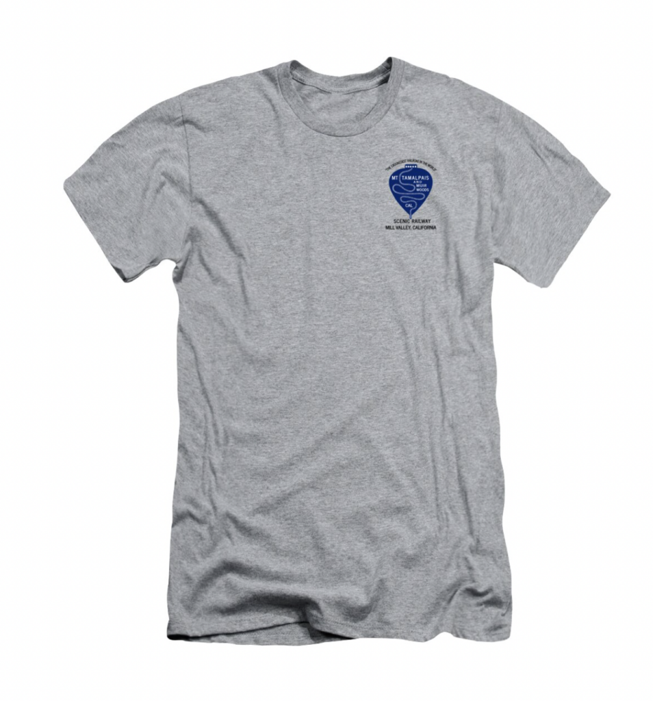 Graphic with a transparent background, and a blue plumb emblem showcases a winding railway track representing the Mount Tamalpais and Muir Woods Scenic Railway in California.