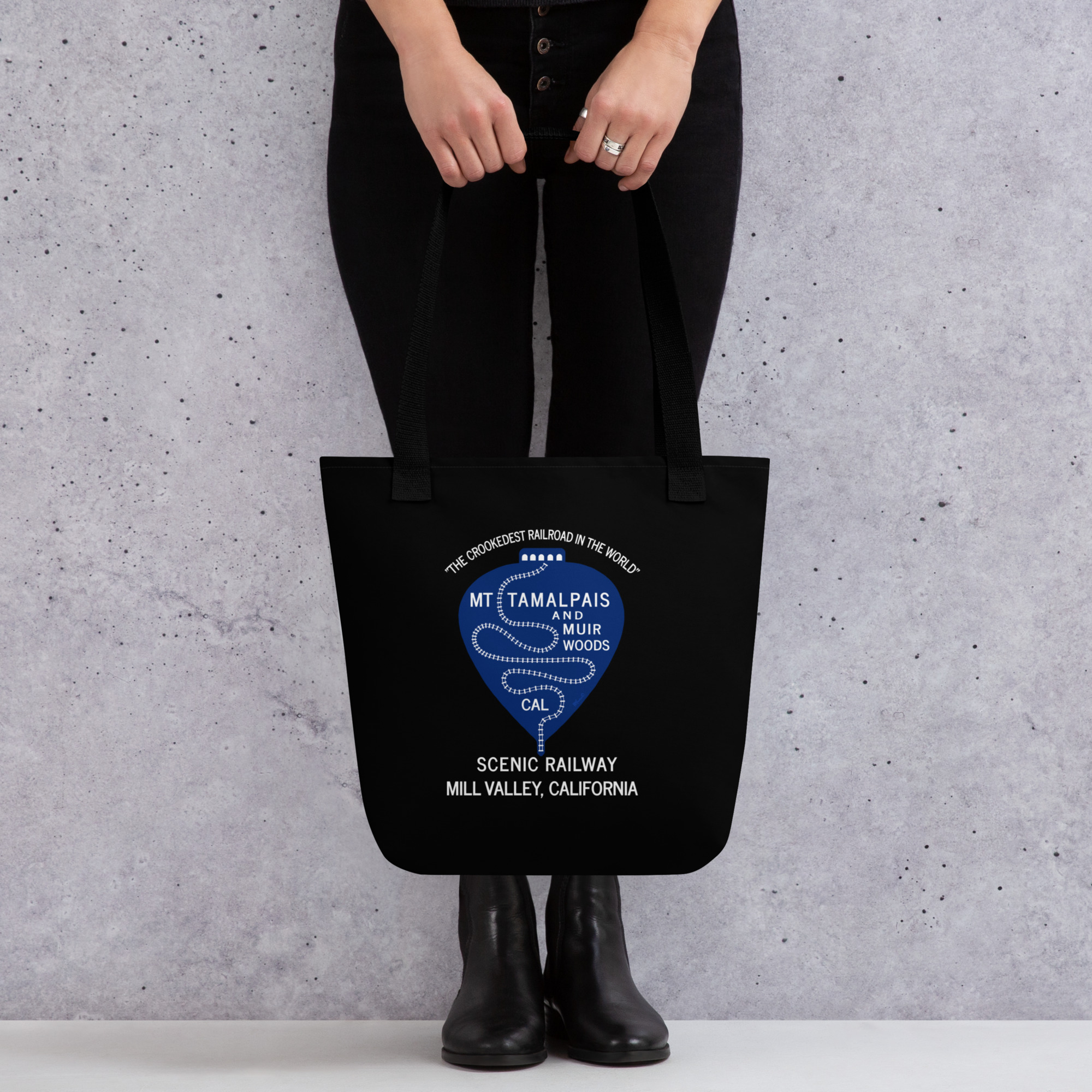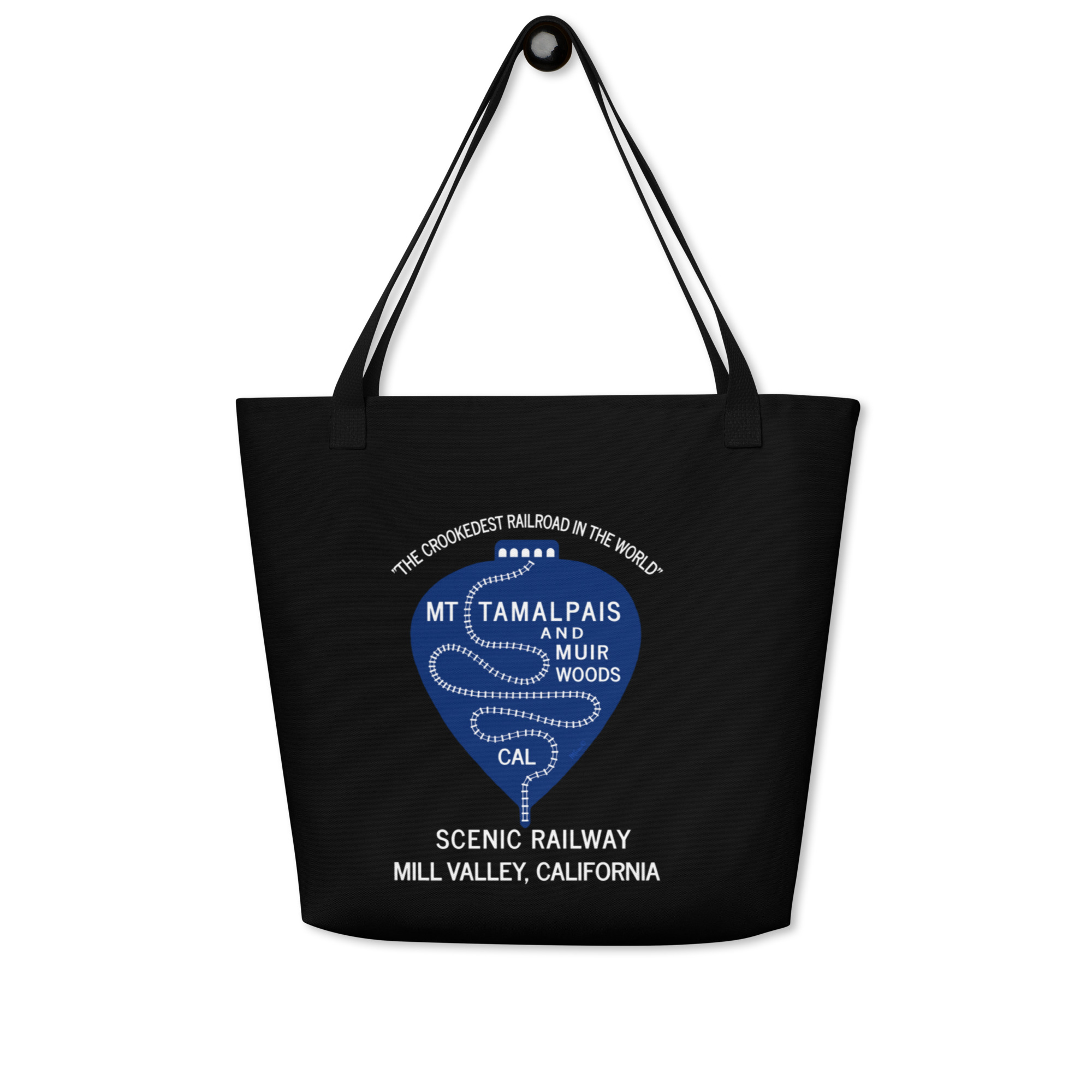 All-Over Print Large Tote Bag 1911 Crookedest Railroad Mt Tamalpais and Muir Woods CA White Text