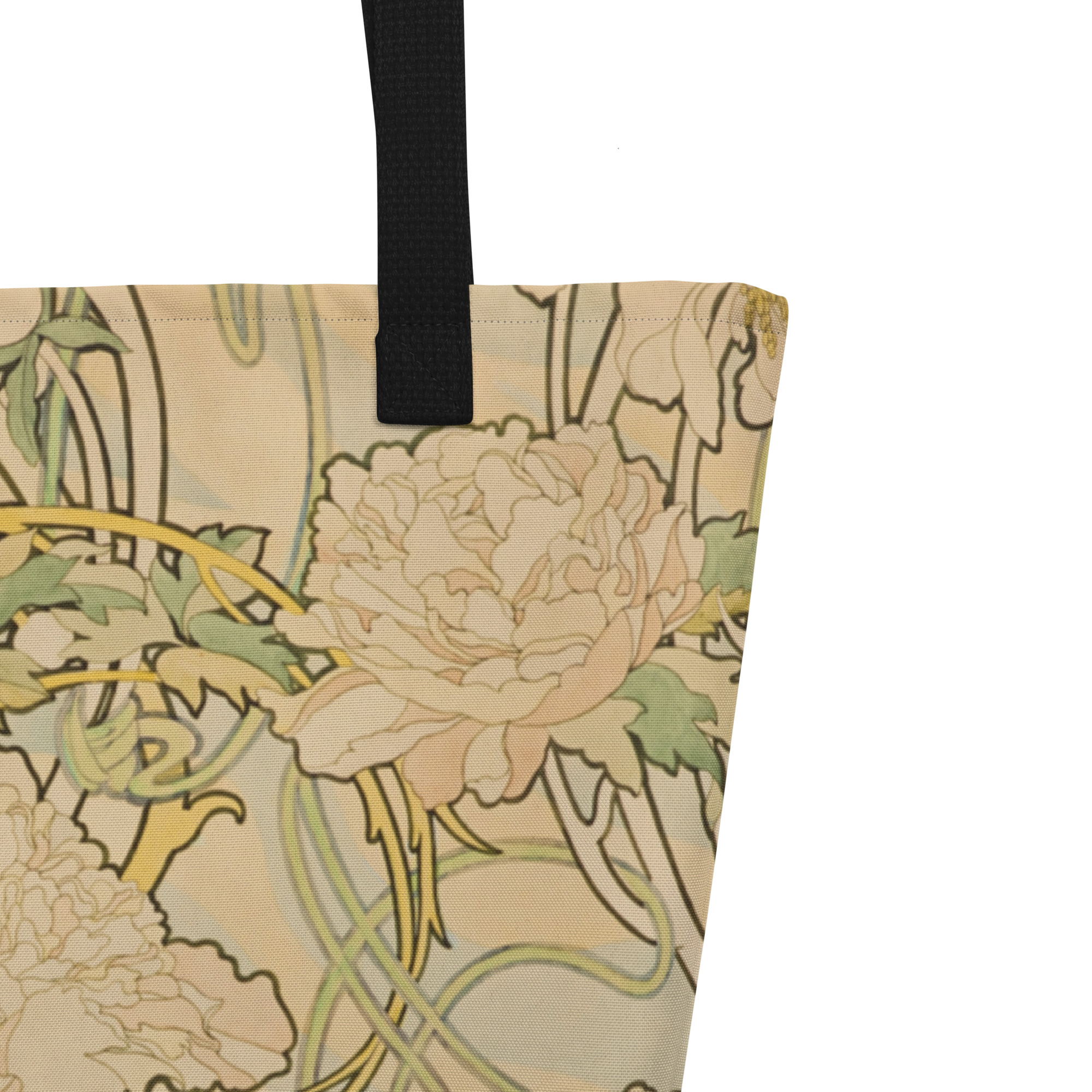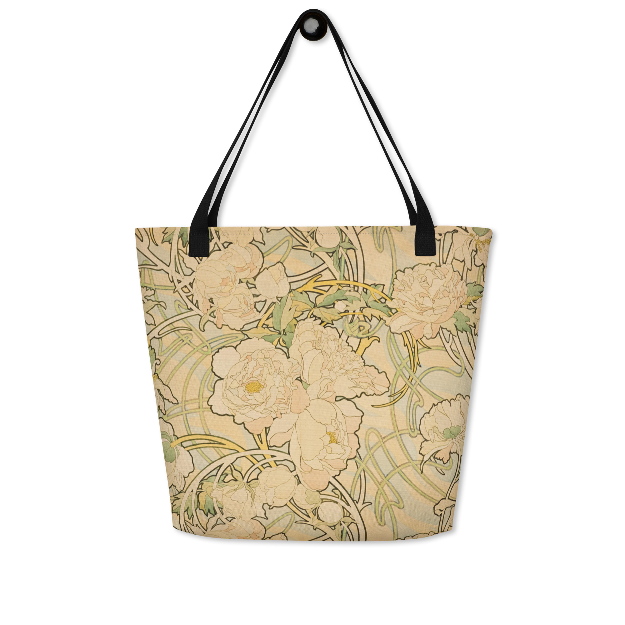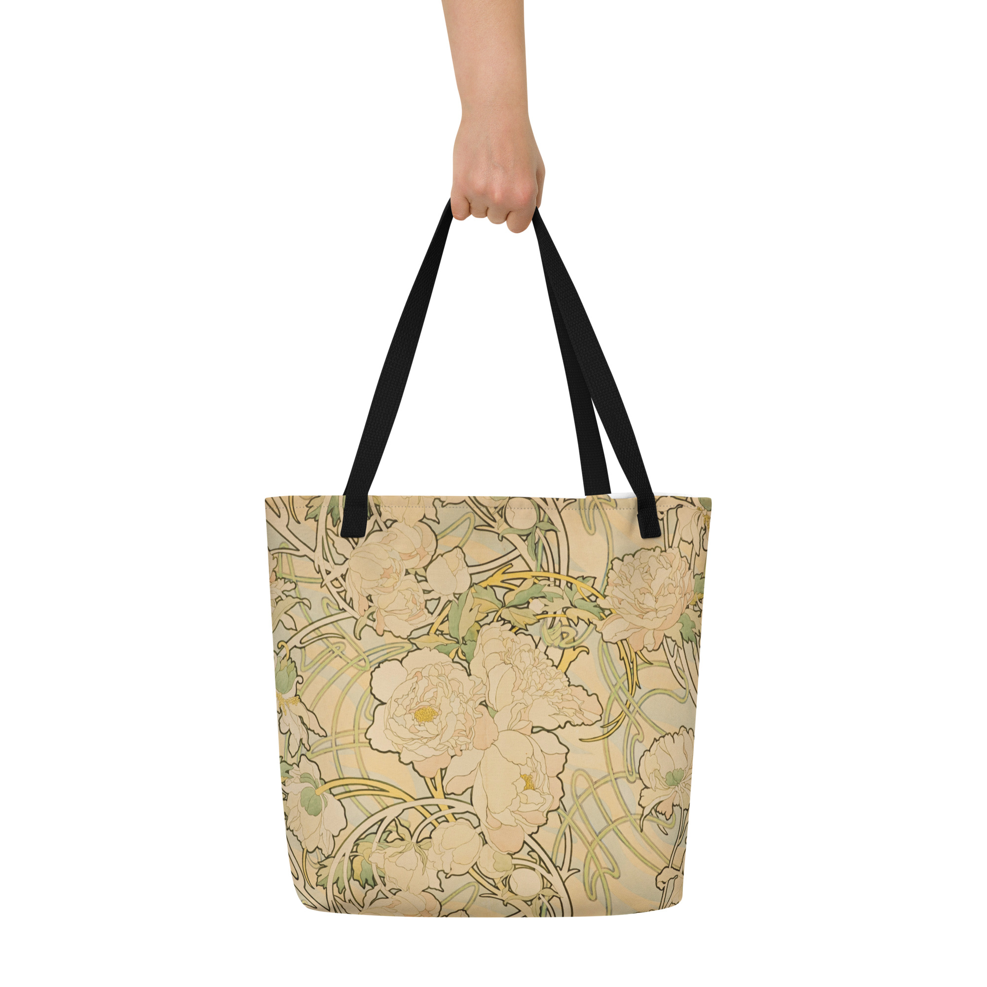 All-Over Print Large Tote Bag Alphonse Mucha Peonies Vintage 1897