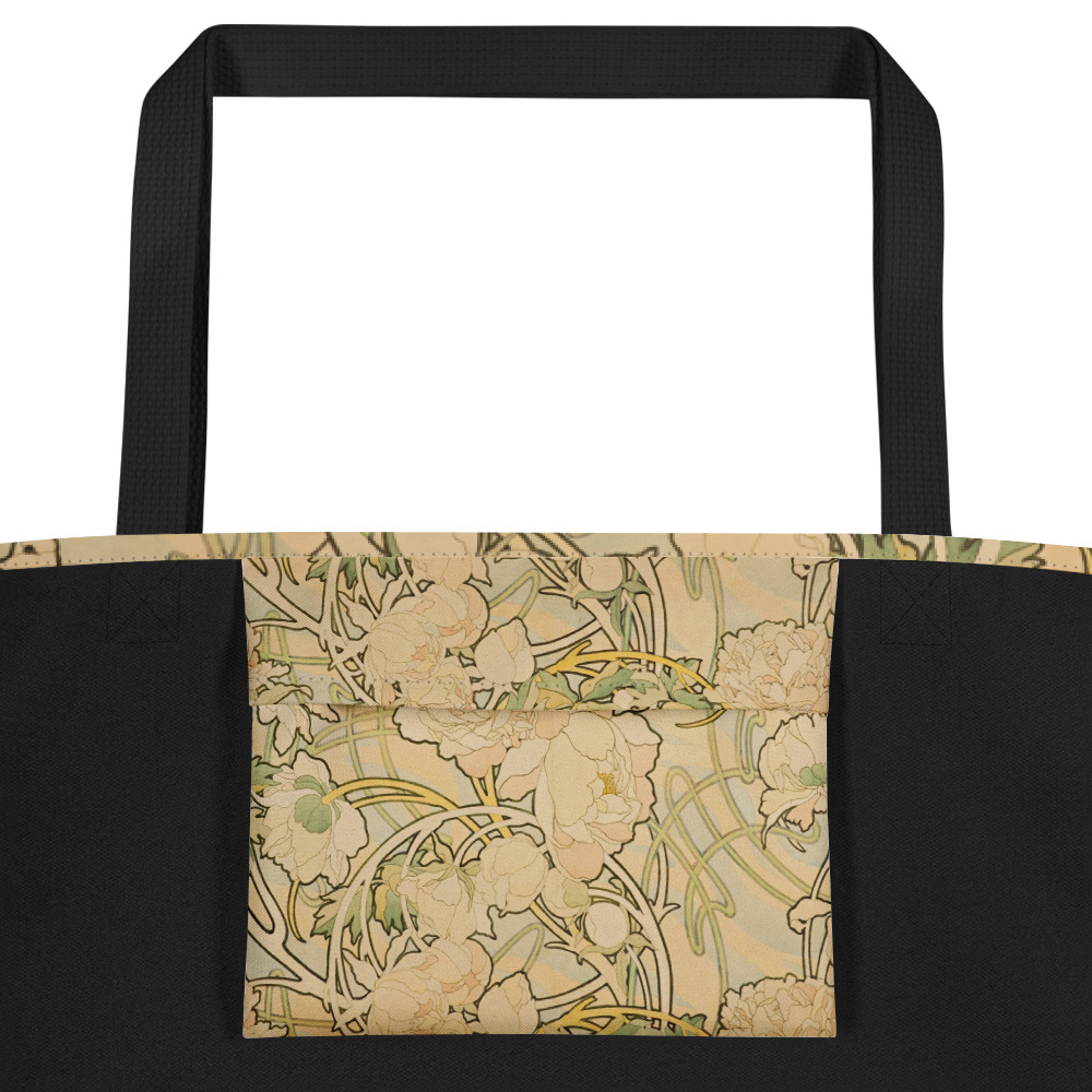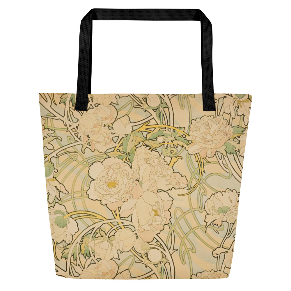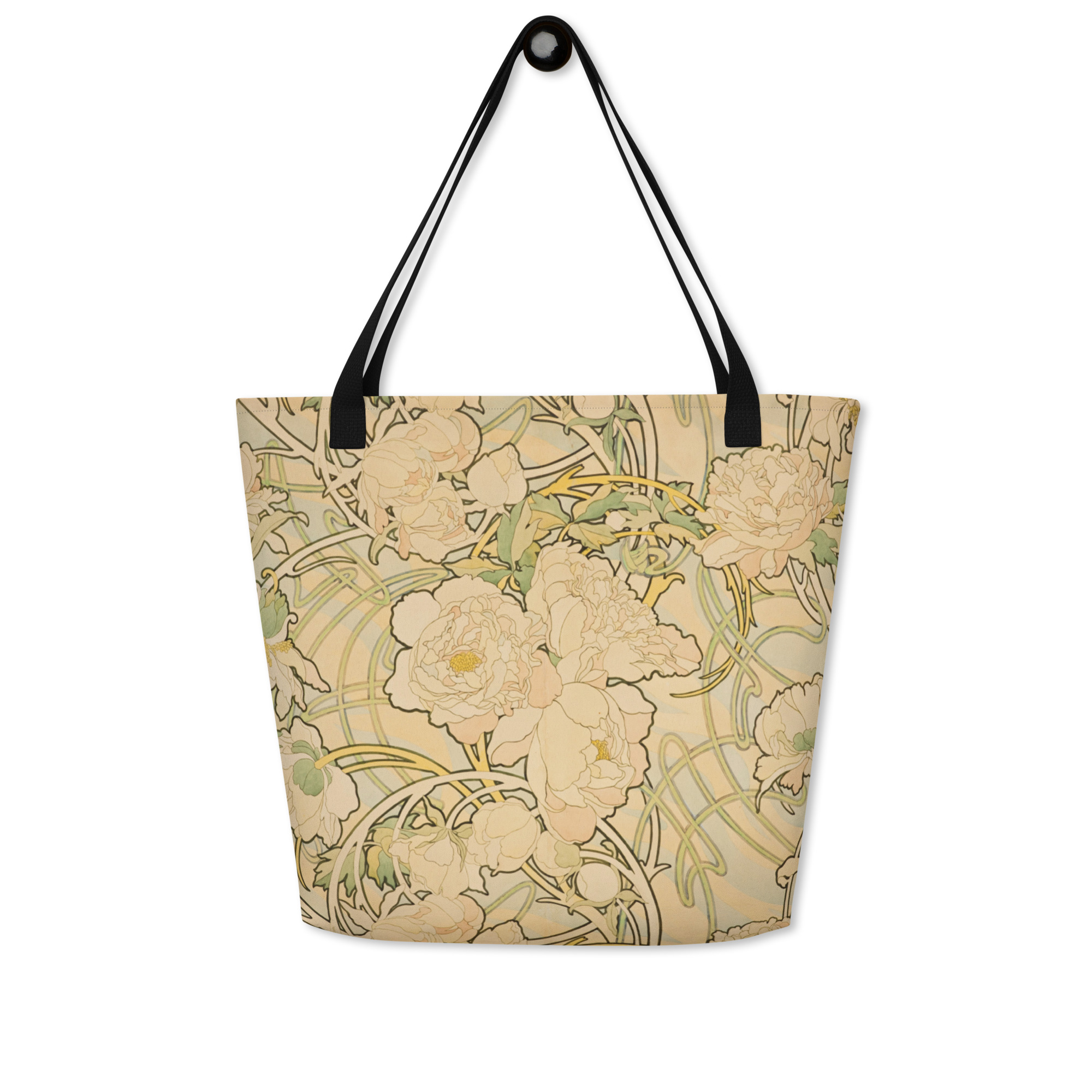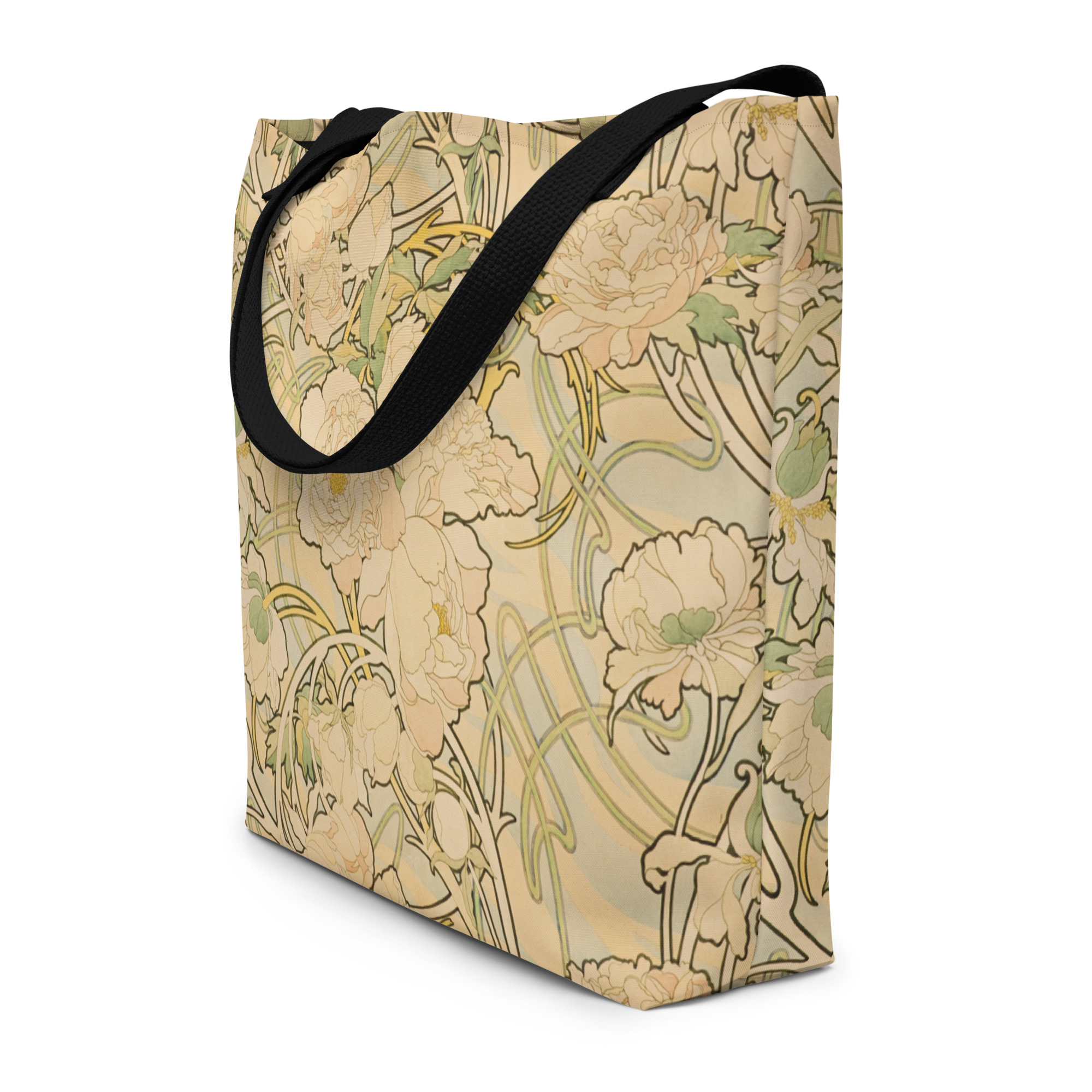 All-Over Print Large Tote Bag Alphonse Mucha Peonies Vintage 1897