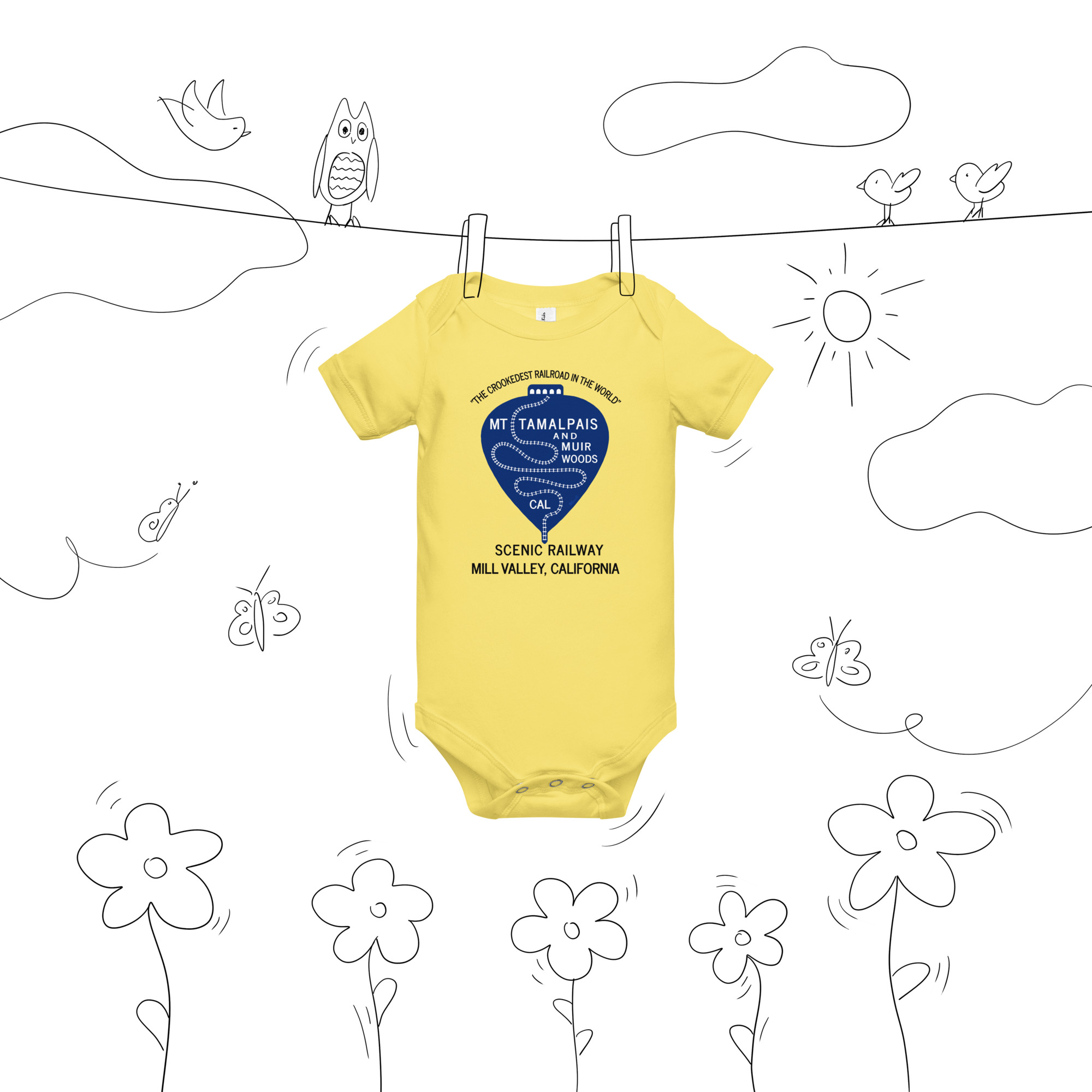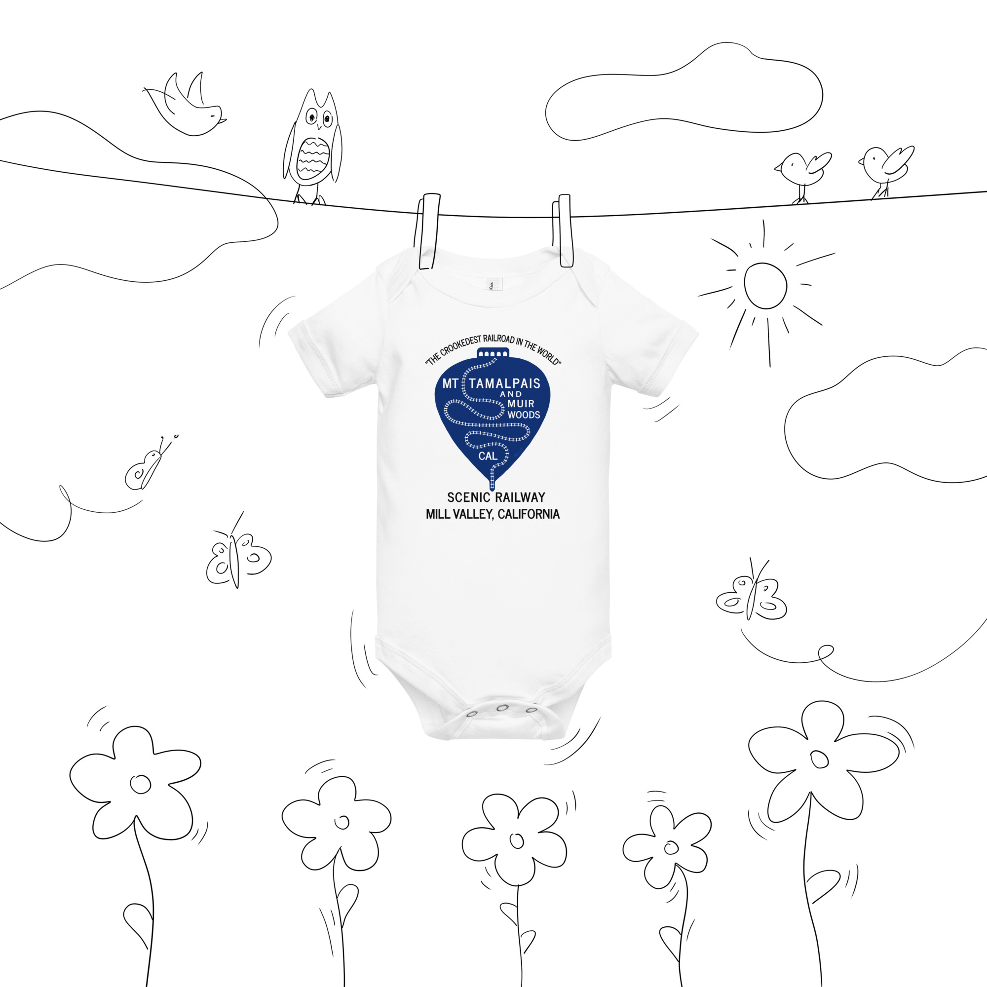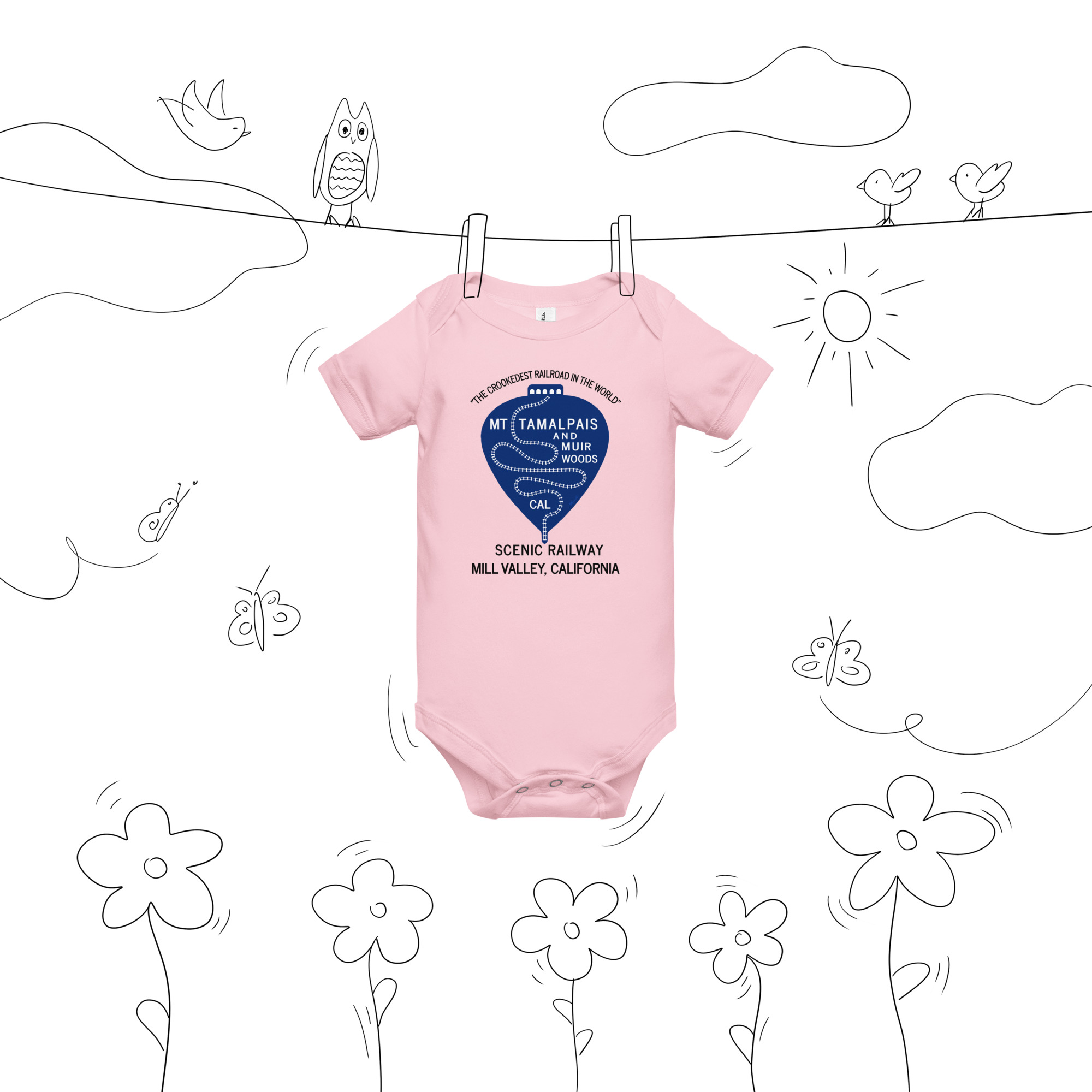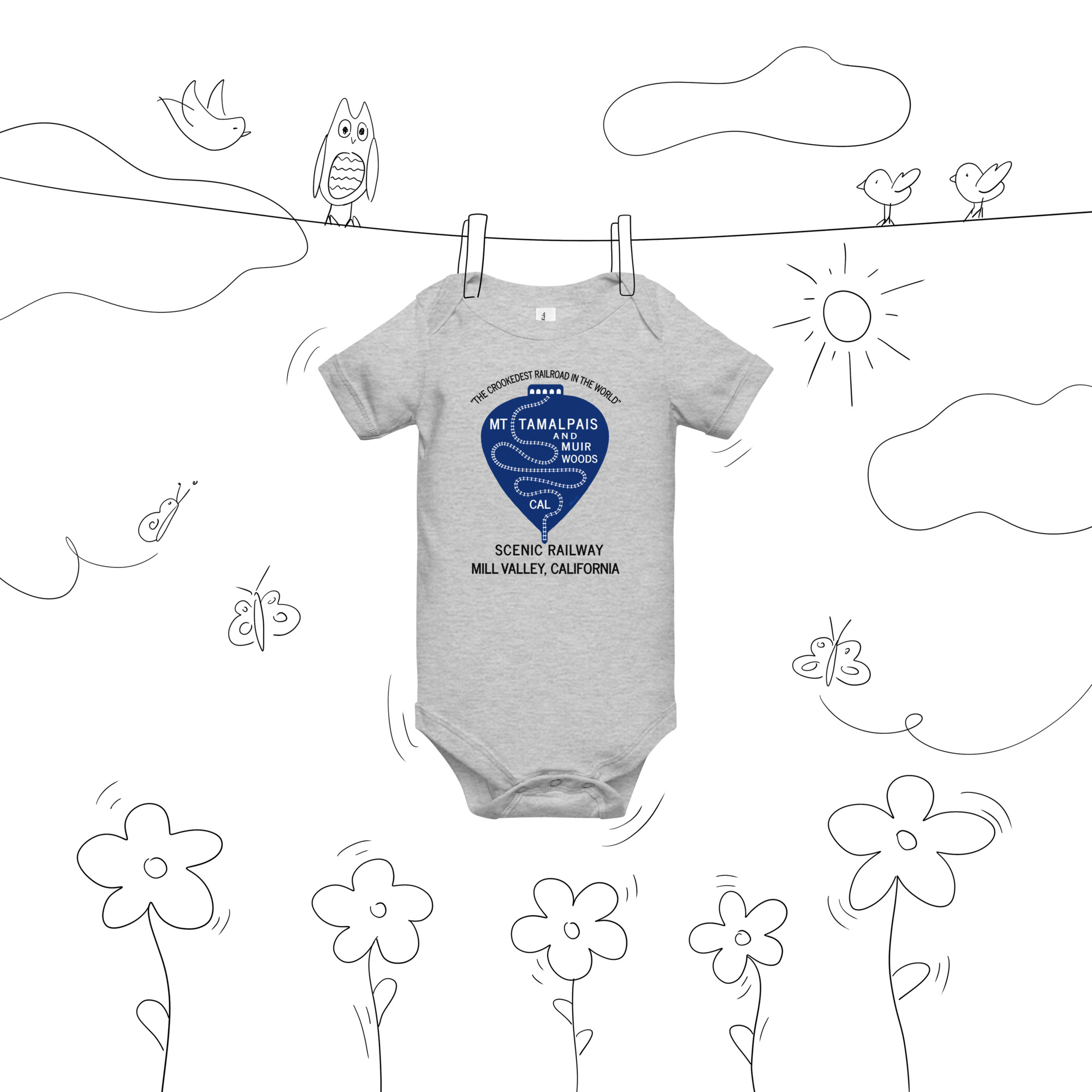 Baby short sleeve one piece 1911 Crookedest Railroad Mt Tamalpais and Muir Woods CA Black Text