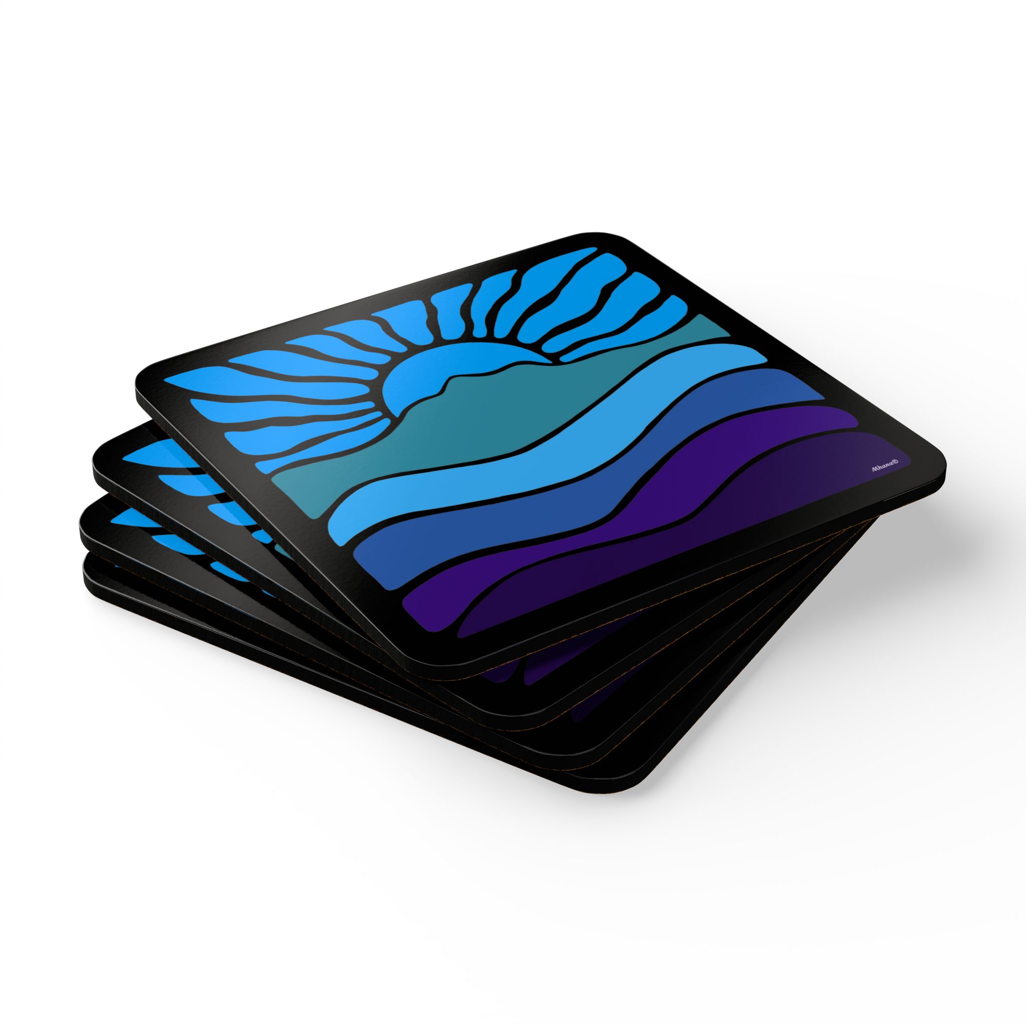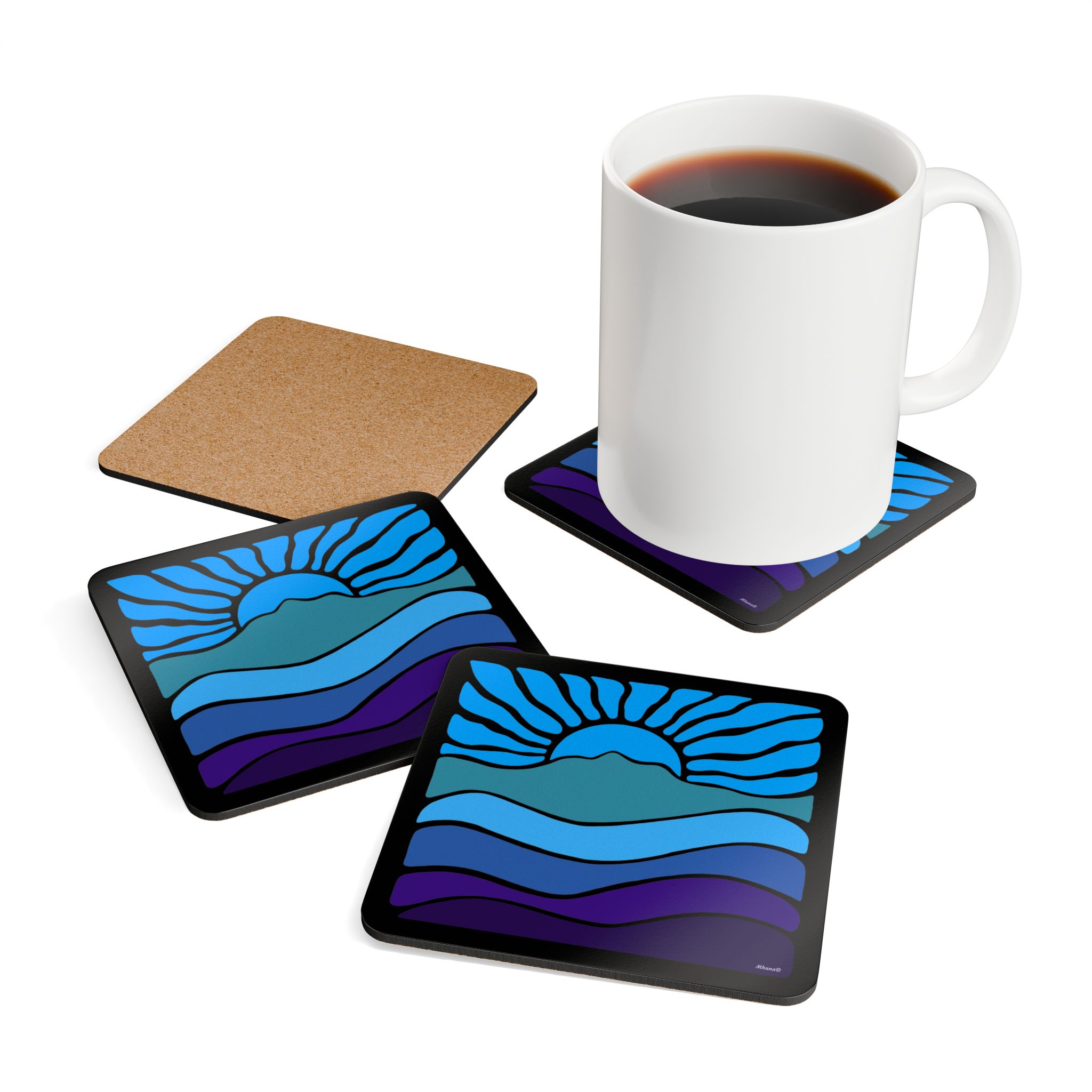 Groovy Retro Mt Tamalpais Sunset Design – Cork Coaster Set of 4 – Sky Blues – Made in USA