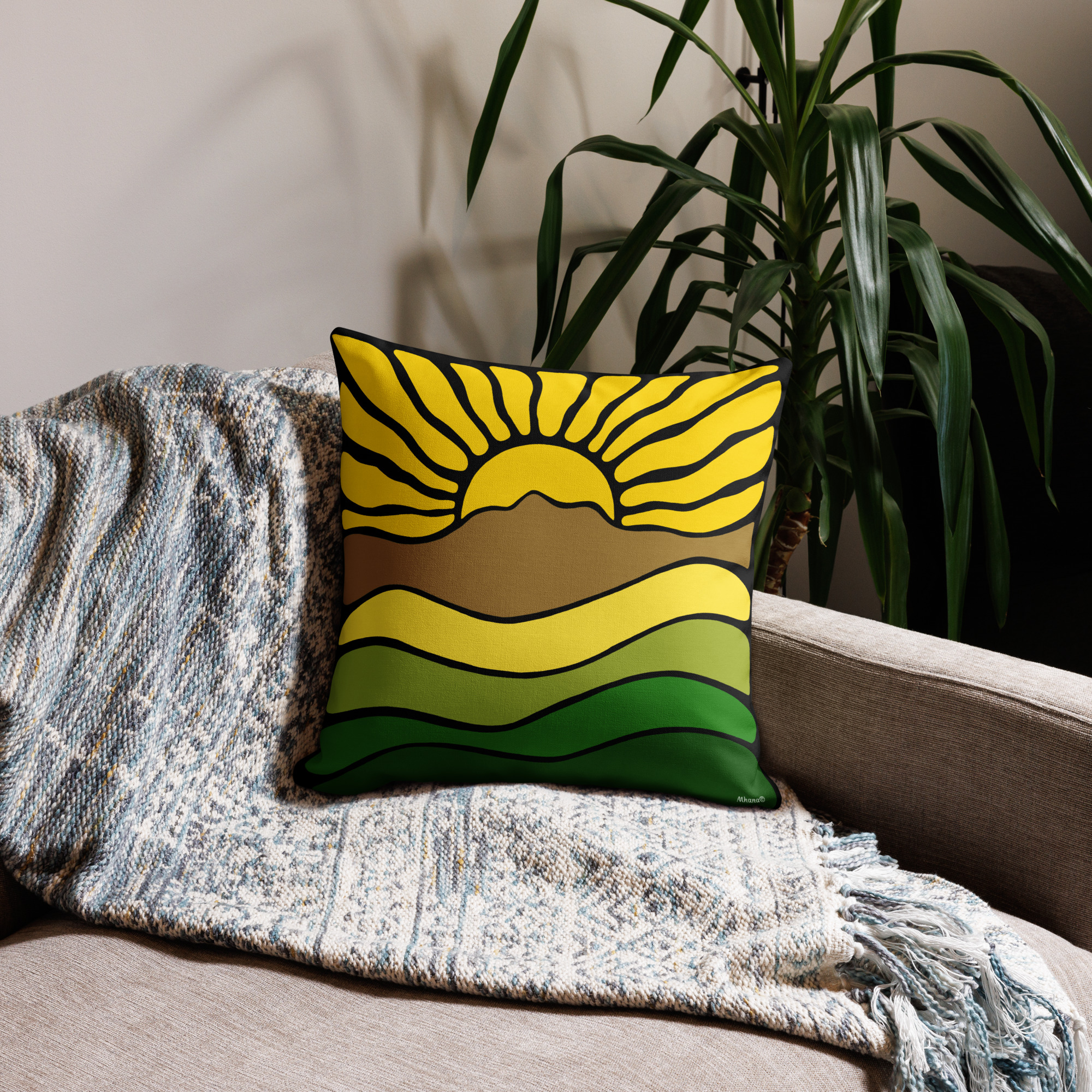 Premium Pillow Mt Tamalpais Groovy Retro Sun Landscape Design – Yellow