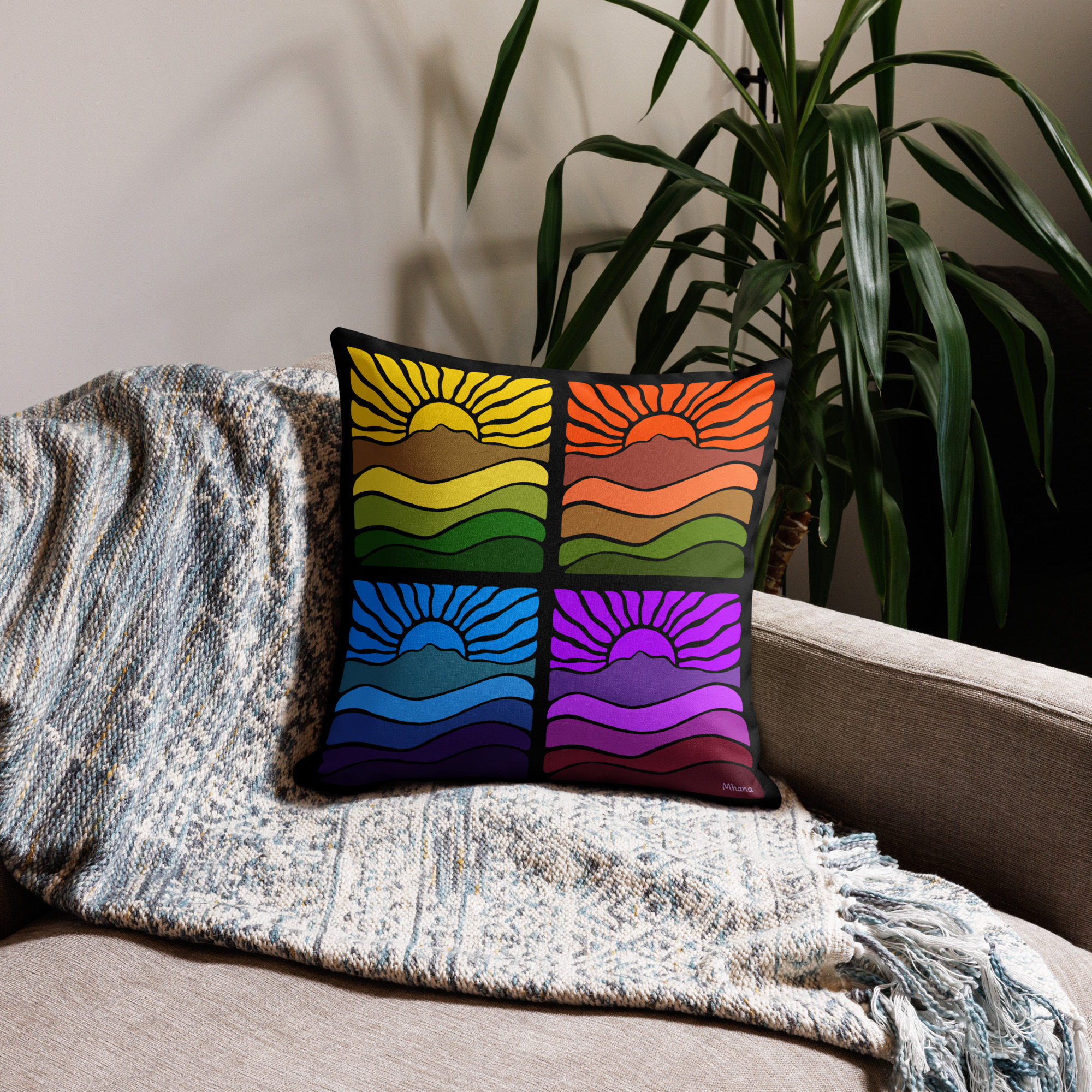 Premium Pillow Mt Tamalpais Groovy Retro Sunrise Landscape Design X4 Rainbow